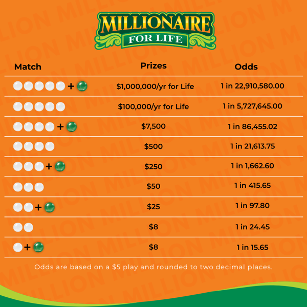 Millionaire for Life offers overall prize odds of 1 in 8.46, with top prize odds of 1 in 22.9 million.